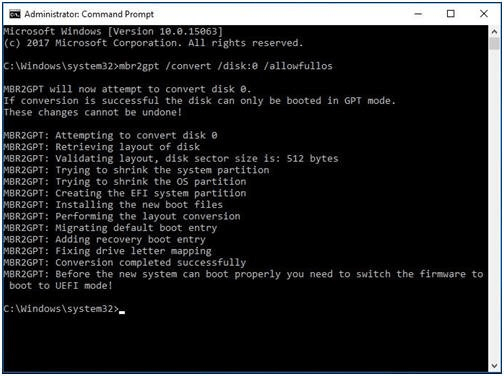 3. 「mbr2gpt/convert/allowfullos」を入力し、Enterキーを押します。(ディスクを指定する必要がある場合は、「mbr2gpt/convert/disk 0/allowfullos」と入力できます。)
