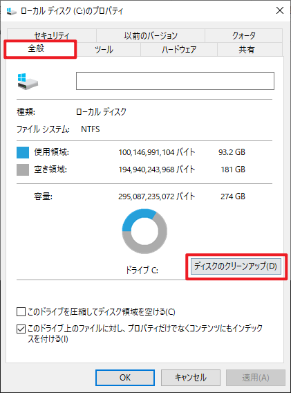 ステップ 2. 次に、「全般」タブをクリックし、「ディスクのクリーンアップ」ボタンをクリックします。