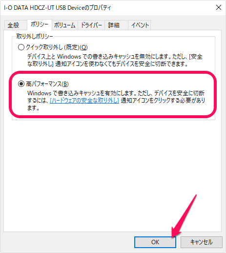ステップ 4. 「ポリシー」タブをクリックし、「高パフォーマンス」を選択し、「OK」をクリックしてすべての変更を確認します。