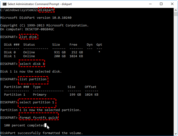Diskpart>list disk>select disk 1>list partition>select partition 1>format fs=ntfs quick