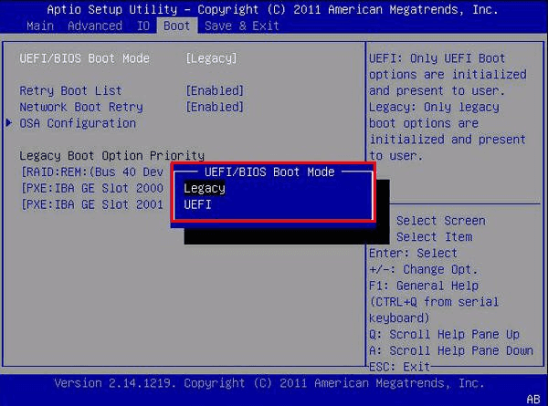 GPT HDDをMBR SSDにクローンした場合、またはMBR HDDをGPT SSDにクローンした場合は、ブートモードをUEFIからLegacyまたはLegacyからUEFIに変更する必要があります。間違ったブートモードでは、クローン後にSSDが起動しなくなります。