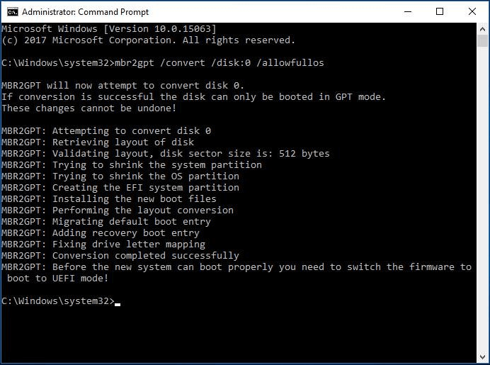 次に、MBR2GPTディスク変換ツールを使用して、上記のコマンドでMBRディスクをGPTディスクに変換できます。例えば: