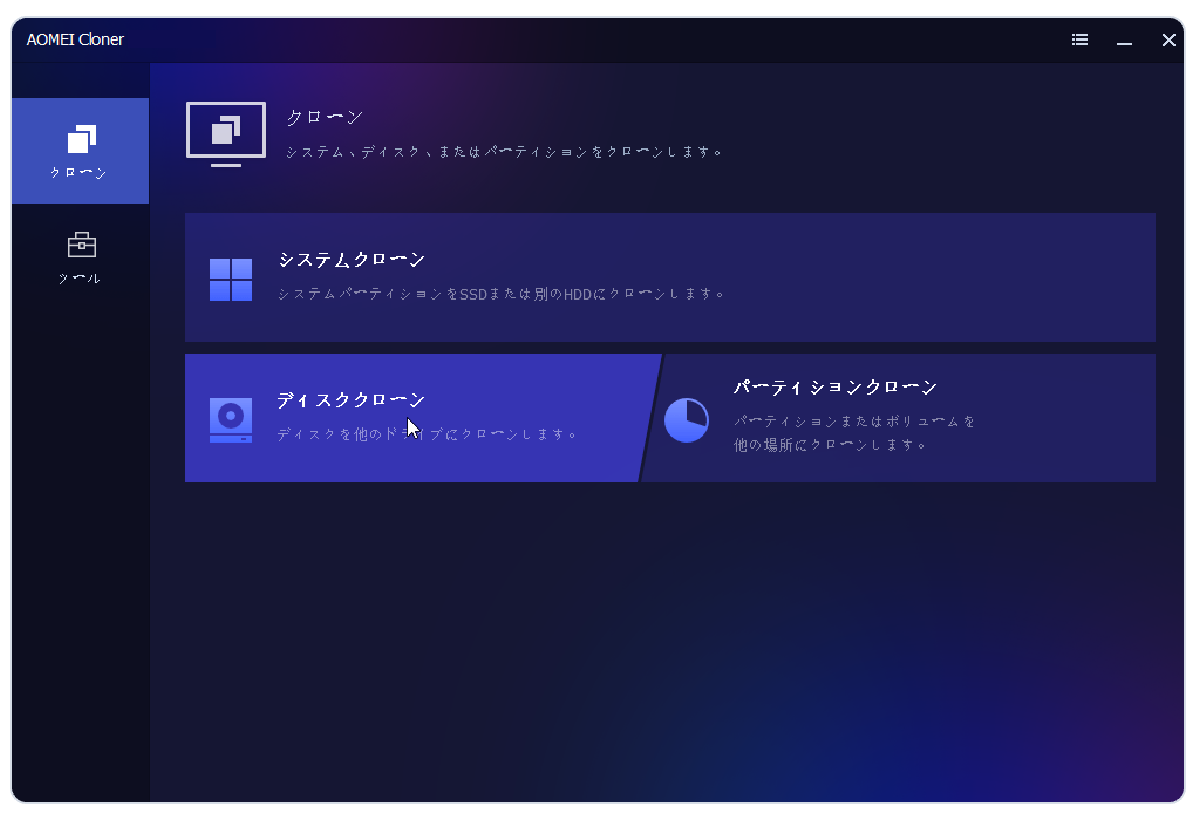 AOMEI Clonerをインストールして実行します。左ペインの「クローン」をクリックし、「ディスククローン」を選択します。