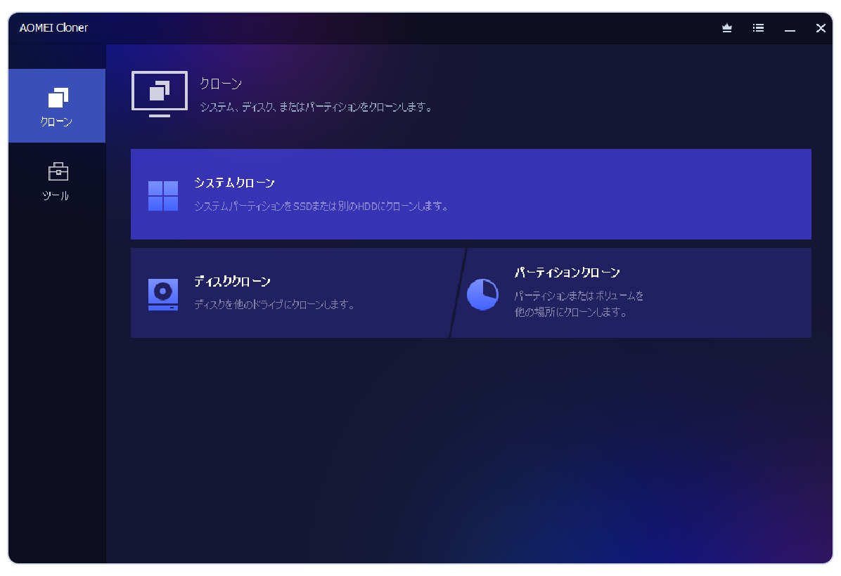 SSDをコンピューターに接続し、認識されることを確認してください。AOMEI Clonerをインストールして実行します。左ペインの「クローン」⇒「システムクローン」を選択します。