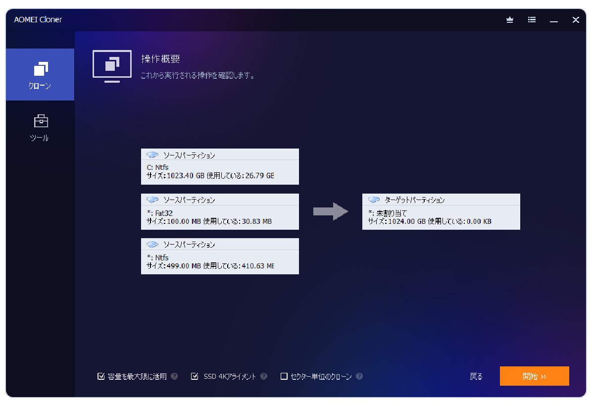 SSDを使用している場合、読み書き速度をさらに高速化するため「SSD 4Kアライメント」にチェックを入れます。最後に「開始」をクリックしてシステムクローンを実行します。