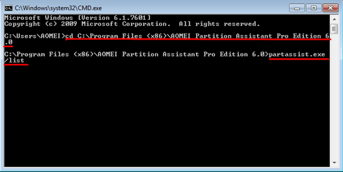 ● partassist.exeを起動するためにcd + AOMEI Partition Assistant Professionalのインストールディレクトリ(例え、cd C:\Program Files (x86)\AOMEI Partition Assistant Pro Edition 6.0)を入力してEnterを押します。
