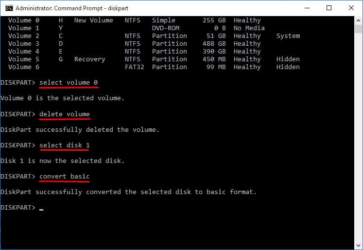 または、DiskPart.exeツールを使用することもできます。このツールは、ボリュームのないダイナミックディスクをベーシックディスクに変換するのにも役立ちます。詳しい手順は次のようにリストされています: