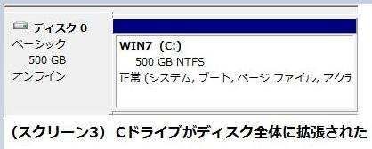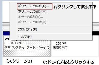 500GBのハードディスクには300GBのドライブCと200GBの未割り当て領域があります。以下のスクリーン1の通りです。
