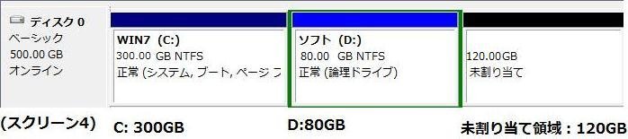 500GBのハードドライブには、300GBのドライブCがあり、80GBのドライブDがあり、また、未割り当て領域が120GBあります。以下のスクリーン4の通りです。
