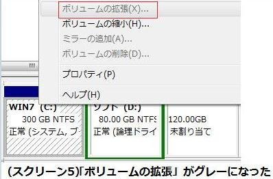 この時、ドライブCを右クリックすると、「ボリューム拡張」がグレーになって、無効になりました。どうして?原因はドライブCの隣に未割り当て領域がないことです。スクリーン5をご覧下さい。