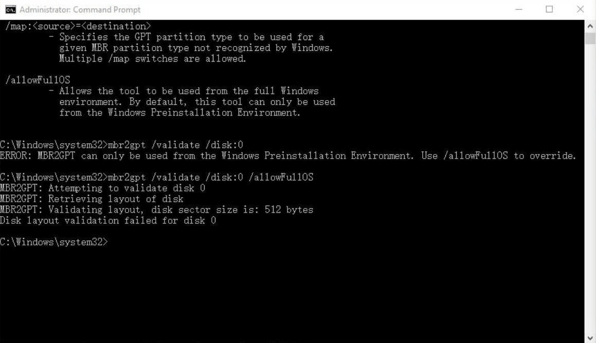 ただし、Windows 7やWindows 8/8.1などの以前のバージョンのWindowsがインストールされているシステムディスクのオフライン変換は、公式にはサポートされていません。したがって、MBR2GPTツールを使用してMBRからGPTへの変換を実行できるように、最初にオペレーティングシステムをWindows10にアップグレードする必要があります。さらに、「ディスク0のディスクレイアウト検証に失敗しました(disk layout validation failed for disk 0)」という問題が発生する可能性があります。