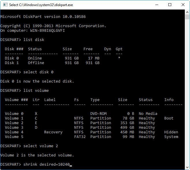 - shrink desired=10240 ········ボリュームには10240MB(10GB)を縮小